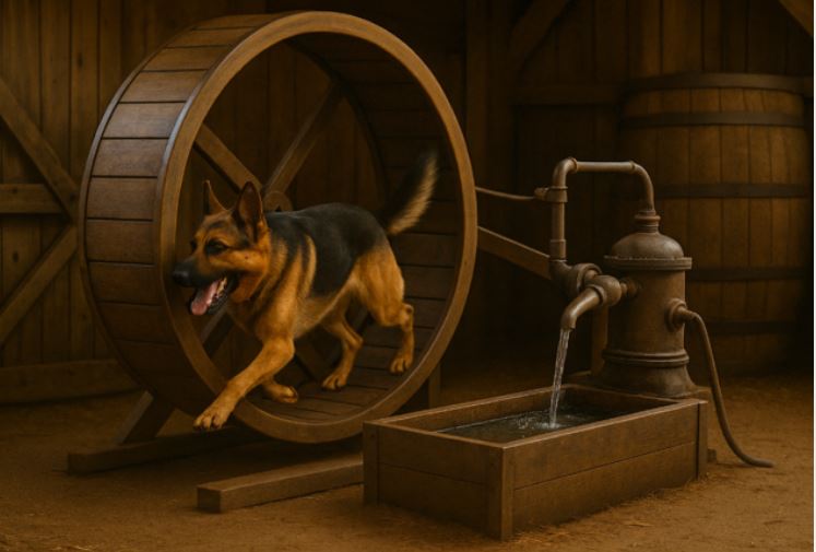 Dans l’étable, une grande pompe à eau était reliée à une immense roue de bois, un peu comme une roue de hamster, mais assez grande pour qu’un chien y entre et la fasse tourner.